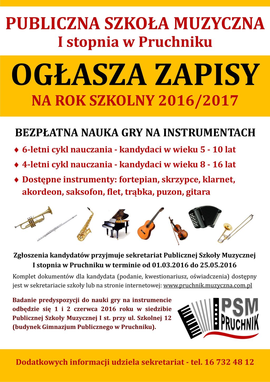 Zgłoszenia kandydatów przyjmuje sekretariat Publicznej Szkoły Muzycznej I stopnia w Pruchniku codziennie w godzinach 10.00 – 16.00 w terminie do 25 maja 2016 roku.