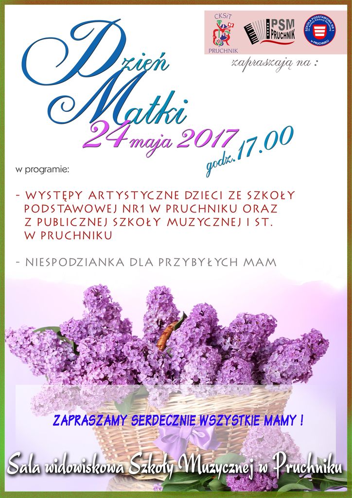 Serdecznie zapraszamy na Koncert z okazji Dnia Matki, który odbędzie się 24 maja 2017 roku o godzinie 17.00 w Publicznej Szkole Muzycznej I stopnia w Pruchniku. Wystąpią soliści, zespoły i grupy artystyczne z Publicznej Szkoły Muzycznej I stopnia w Pruchniku i Szkoły Podstawowej nr 1 w Pruchniku.