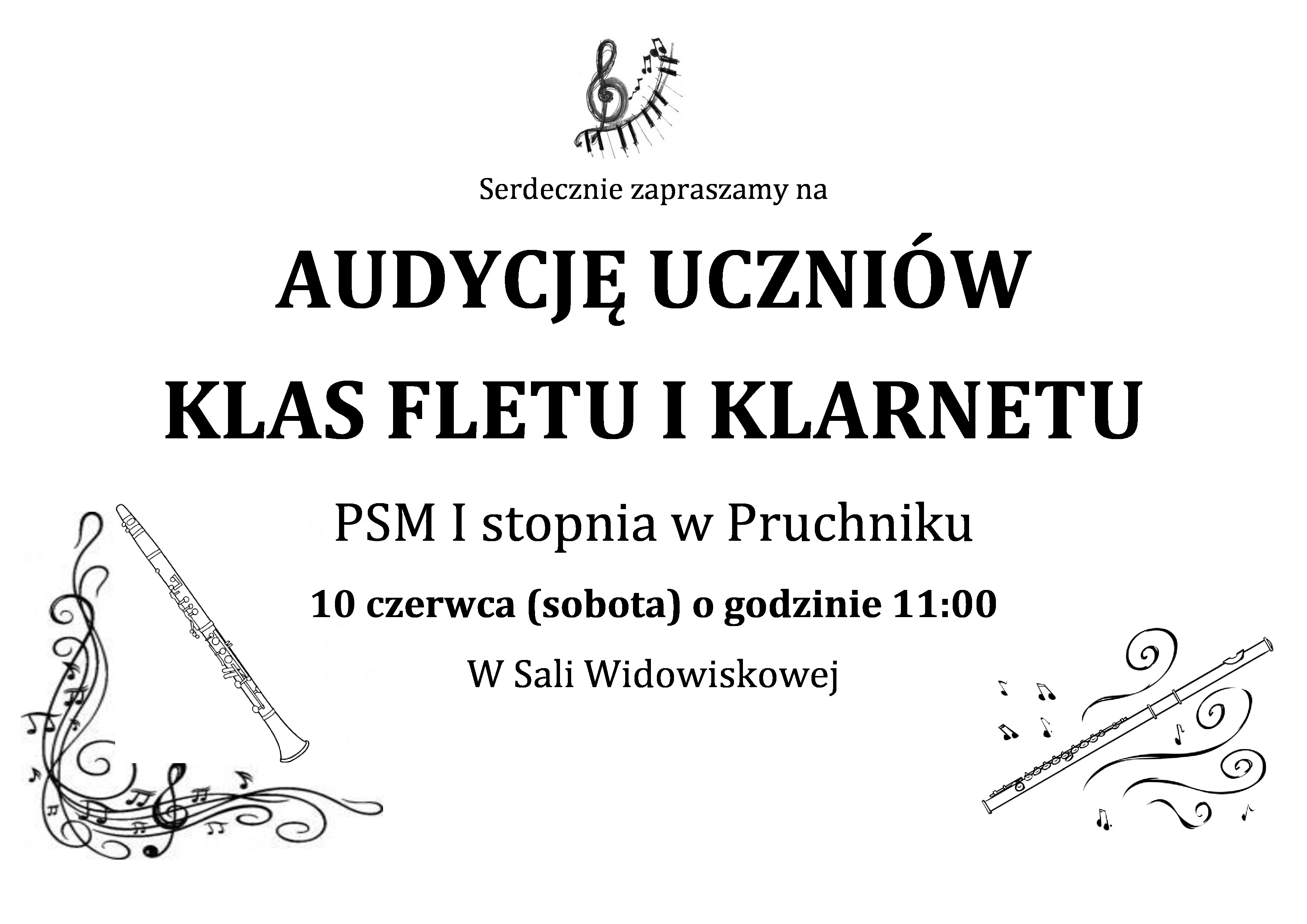 Publiczna Szkoła Muzyczna I stopnia w Pruchniku zaprasza na audycję muzyczną w wykonaniu uczniów klasy fletu p. Jagody Pietrusiak i klasy klarnetu p. Weroniki Bacher-Trzeciak. Popis odbędzie się w Sali Widowiskowej PSM I st. w Pruchniku 10 czerwca 2017 roku o godzinie 11.00.