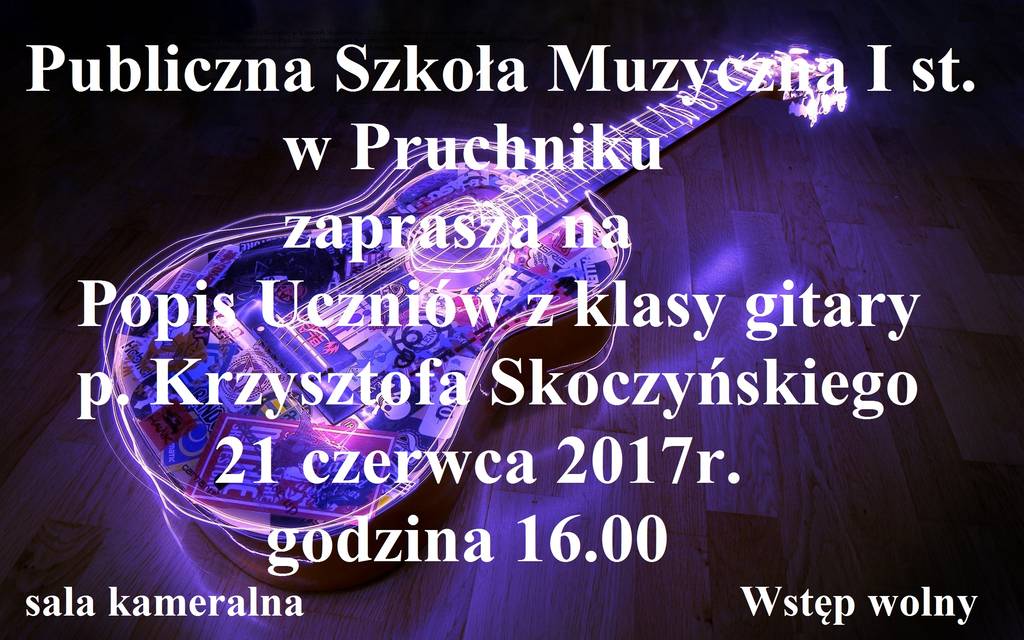 Publiczna Szkoła Muzyczna I stopnia w Pruchniku zaprasza na koncert w wykonaniu uczniów klasy gitary p. Krzysztofa Skoczyńskiego. Popis odbędzie się w Sali Widowiskowej PSM I st. w Pruchniku 21 czerwca 2017 roku o godzinie 16.00.