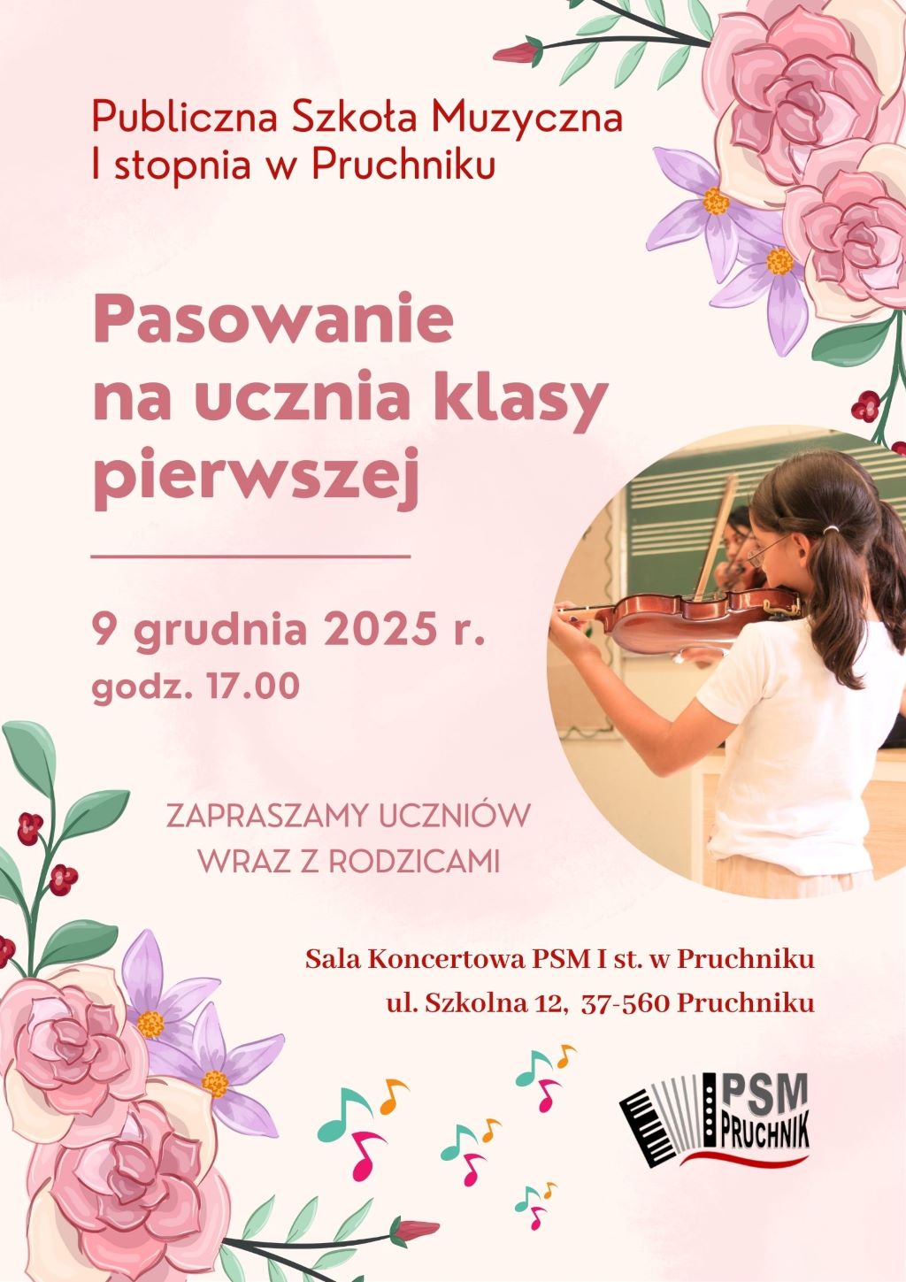 Serdecznie zapraszamy uczniów i rodziców na uroczystość pasowania na ucznia Publicznej Szkoły Muzycznej I stopnia w Pruchniku. Wydarzenie odbędzie się we wtorek 9 grudnia 2025 roku o godzinie 17.00 w Sali Koncertowej.