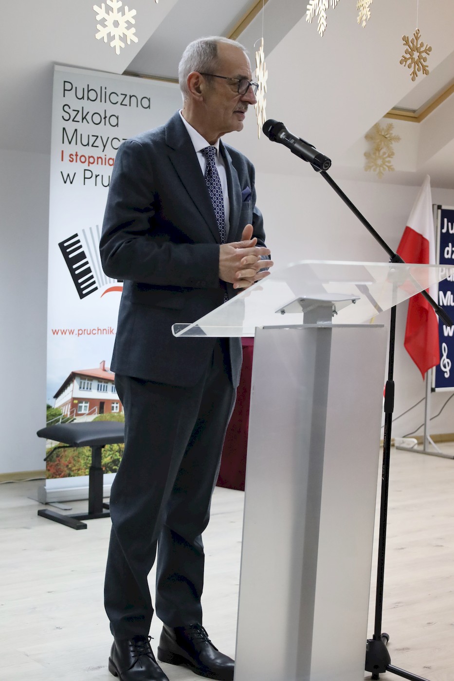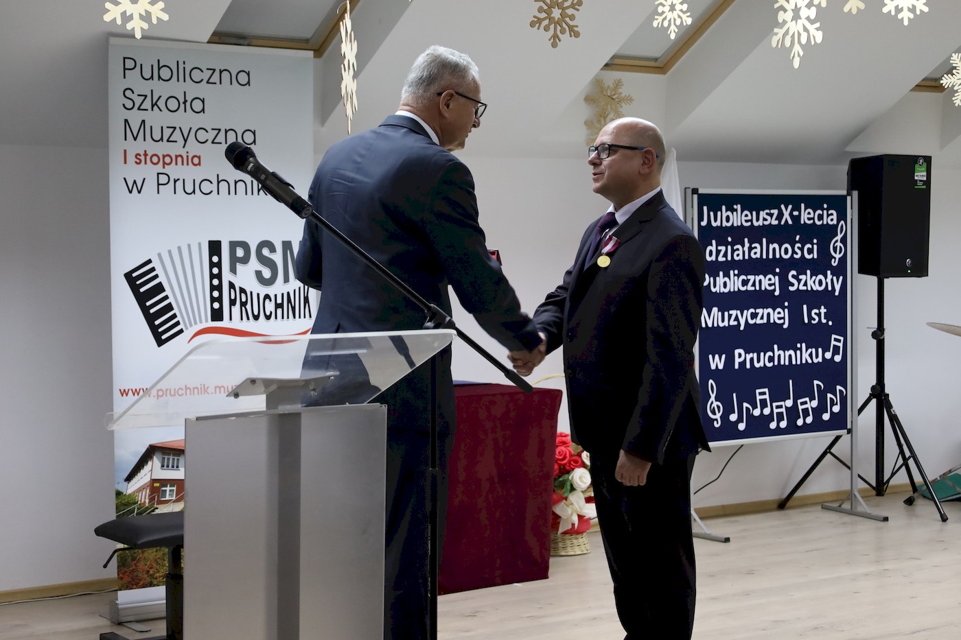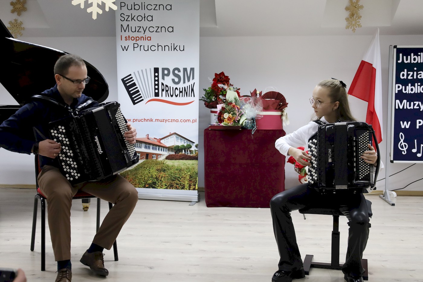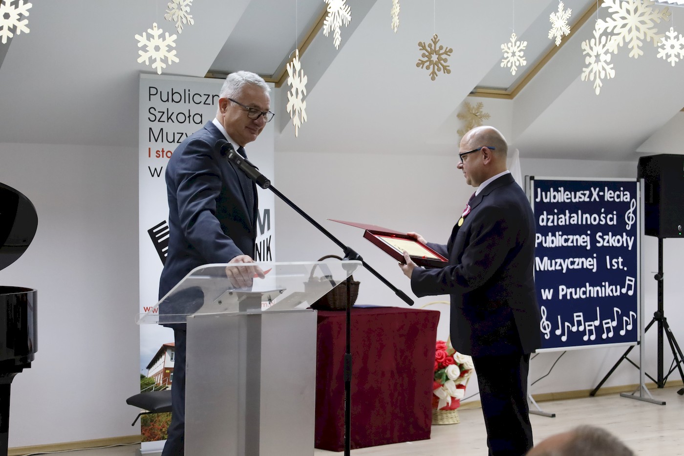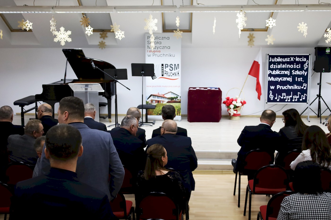 W sobotnie popołudnie 13 grudnia 2025 roku odbył się Koncert Jubileuszowy z okazji X-lecia Publicznej Szkoły Muzycznej I stopnia w Pruchniku. Uroczystość odbyła się w Sali Koncertowej szkoły. Swoją obecnością zaszczycili nas między innymi: prof. Dariusz Dudek – Doradca Prezydenta Rzeczypospolitej Polskiej, Marek Rząsa – poseł na Sejm RP, Zenobiusz Kajda – Przedstawiciel Ministra Kultury i Dziedzictwa Narodowego – Główny Wizytator Centrum Edukacji Artystycznej, Stanisław Kłopot – Burmistrz Pruchnika, Wacław Szkoła – Radny Powiatu Jarosławskiego, poprzedni Burmistrz Pruchnika, inicjator utworzenia naszej szkoły i Ryszard Bugiel – Wójt Gminy Kamień, zaprzyjaźniony z naszą Gminą, który dzielił się swoimi doświadczeniami jak uruchomić szkołę publiczną na przykładzie Gminy Kamień. W uroczystości uczestniczyli także przedstawiciele władz samorządowych, radni, dyrektorzy zaprzyjaźnionych szkół muzycznych Województwa Podkarpackiego, dyrektorzy szkół i instytucji działających na terenie Pruchnika, przedstawiciele Rady Rodziców, uczniowie, rodzice i sympatycy naszej szkoły. Program koncertu obejmował prezentację historii szkoły, wręczenie odznaczeń i nagród, wystąpienia zaproszonych gości, prezentacje artystyczne uczniów, absolwentów i zaproszonych artystów.
