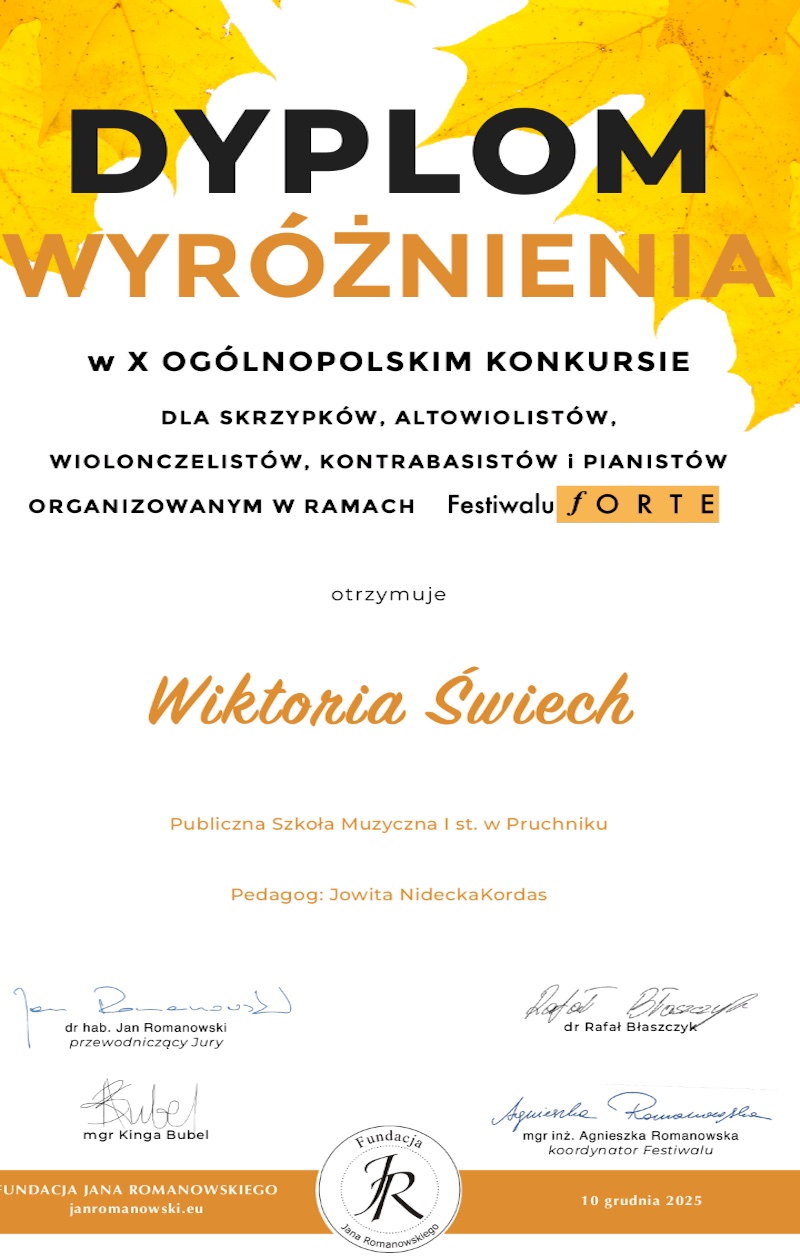 Z satysfakcją informujemy, że Wiktoria Świech z klasy skrzypiec p. Jowity Nideckiej otrzymała Wyróżnienie na X Konkursie Dla Skrzypków, Altowiolistów, Wiolonczelistów, Kontrabasistów i Pianistów w ramach Festiwalu FORTE. Wiktorii akompaniował p. Łukasz Stanisławczyk.