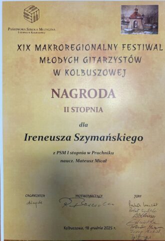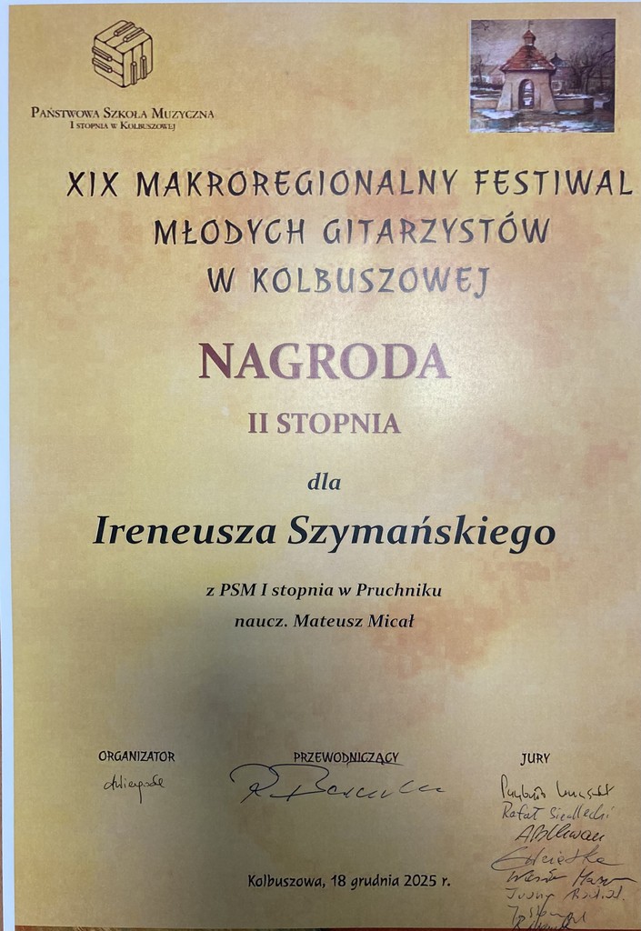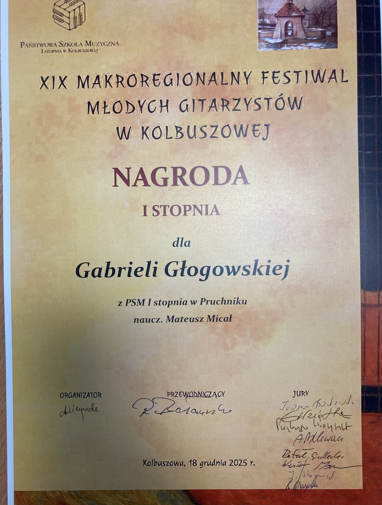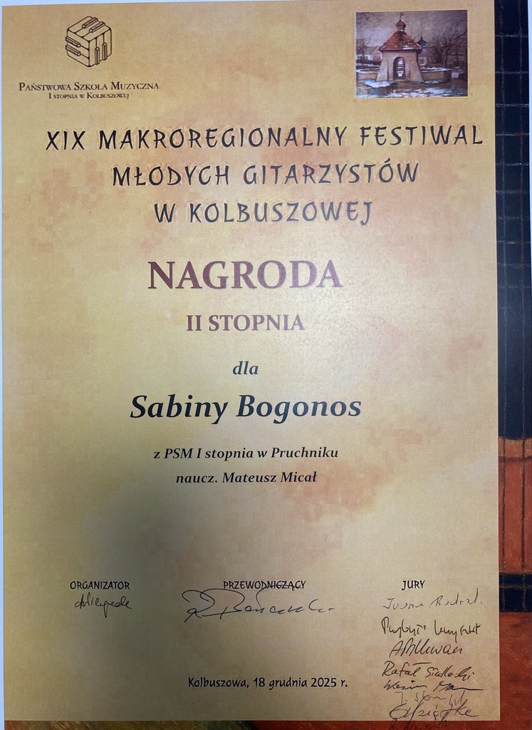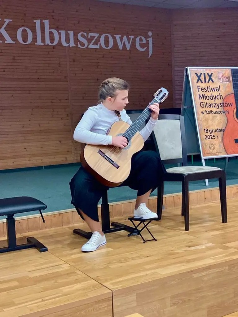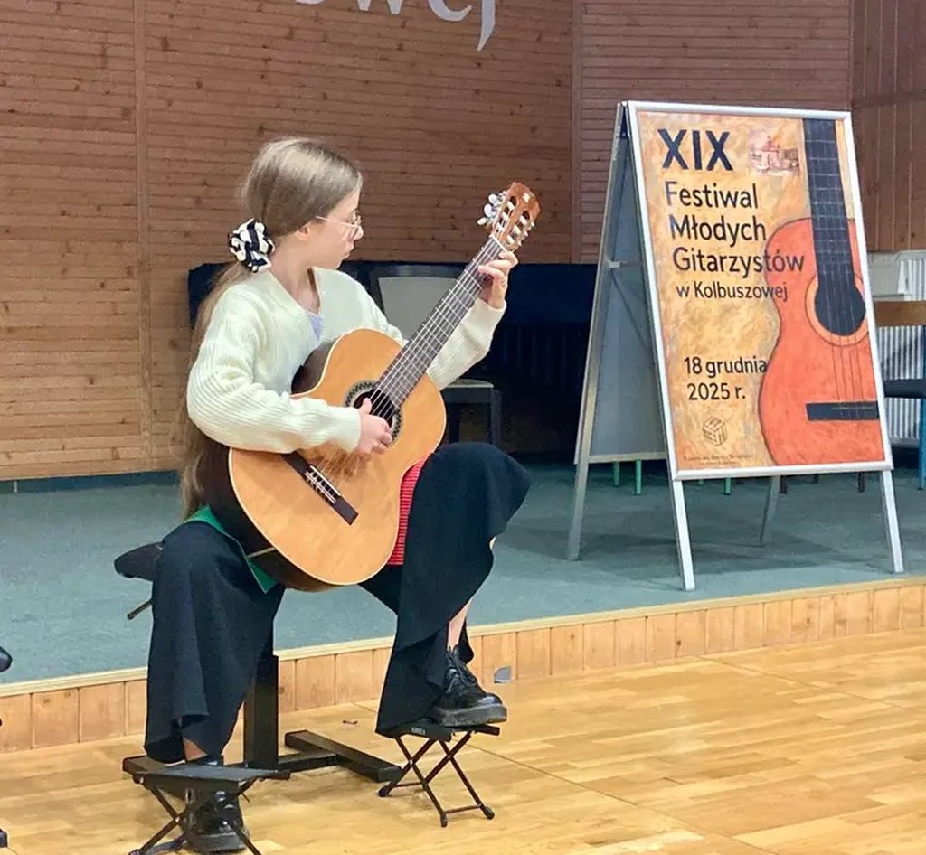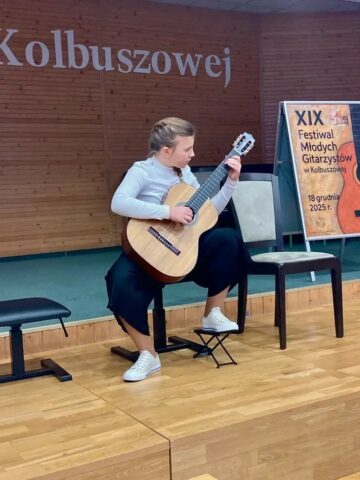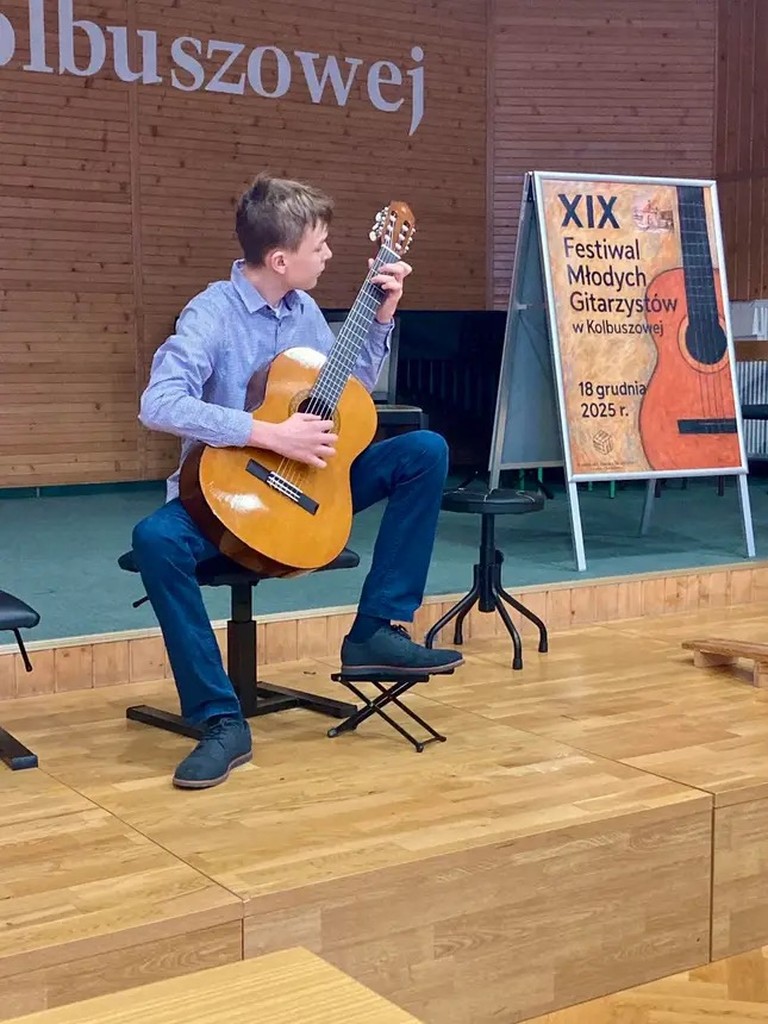 Uczniowie z klasy gitary p. Mateusza Micała wzięli udział w XIX Makroregionalnym Festiwalu Młodych Gitarzystów w Kolbuszowej, który odbył się 18 grudnia 2025 roku.