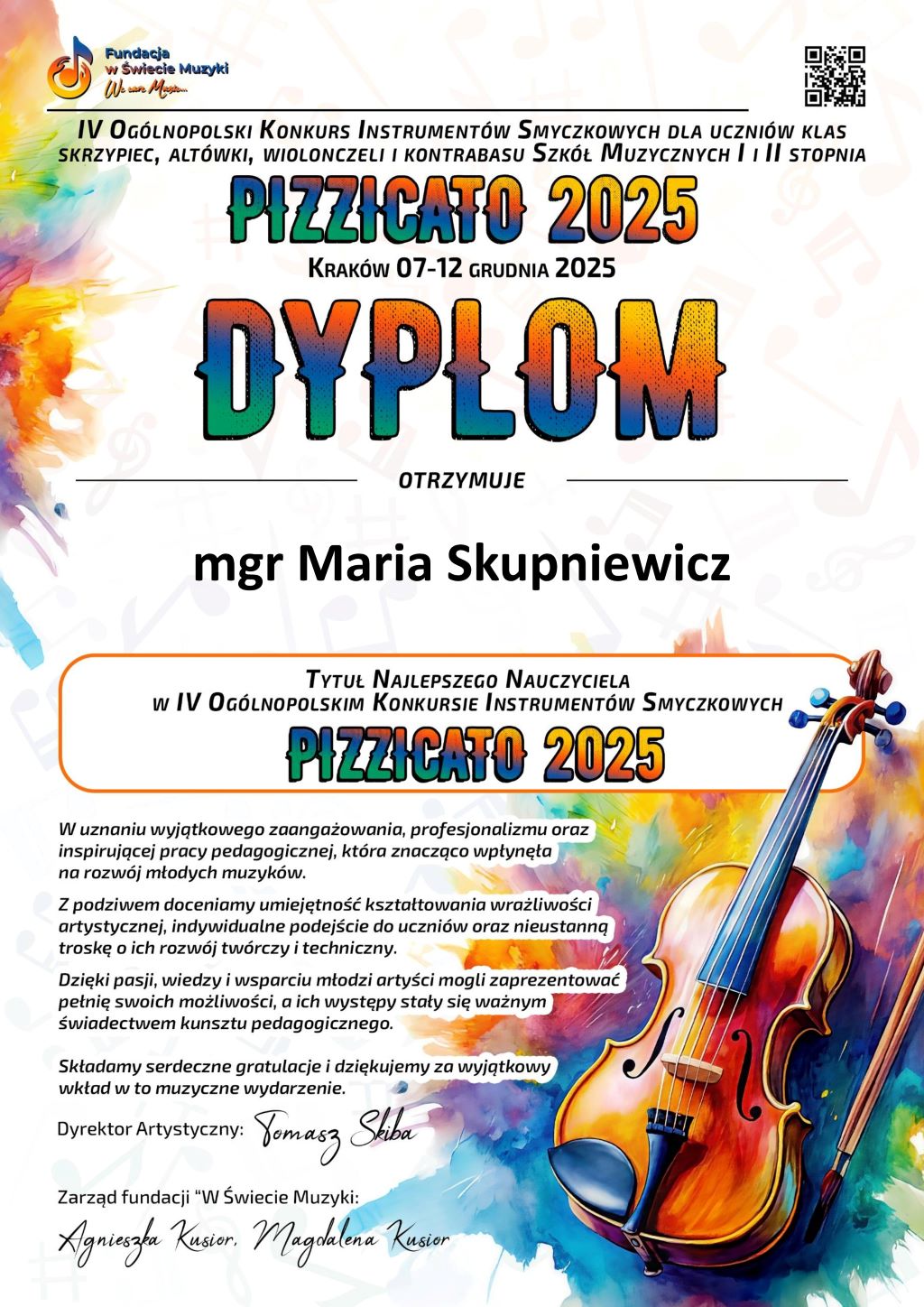 Z satysfakcją informujemy, że Victoria Kulik z klasy skrzypiec p. Marii Skupniewicz otrzymała III Miejsce w IV Ogólnopolskim Konkursie Instrumentów Smyczkowych – PIZZICATO 2025. Victorii akompaniował p. Łukasz Stanisławczyk. Pani Maria Skupniewicz otrzymała Tytuł Najlepszego Nauczyciela konkursu.