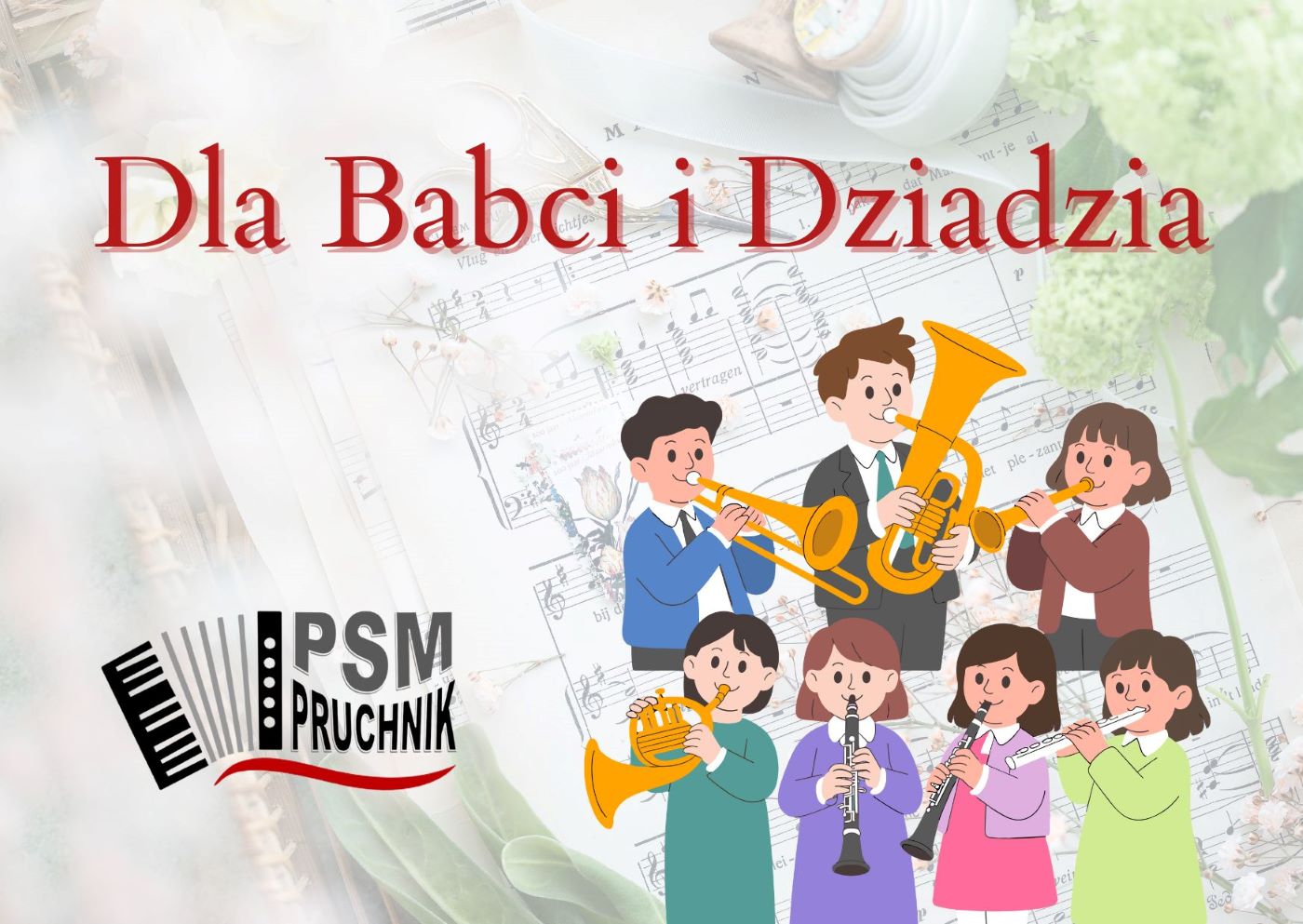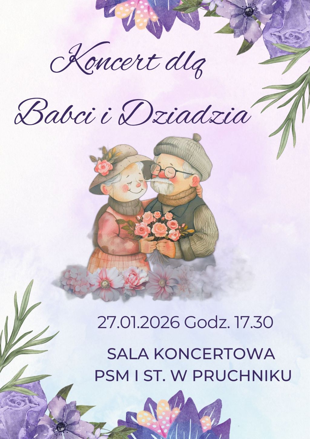 Dyrektor Publicznej Szkoły Muzycznej I st. w Pruchniku zaprasza na Koncert Dla Babci i Dziadzia, który odbędzie się we wtorek 27 stycznia 2026 roku o godzinie 17.30 w Sali Koncertowej szkoły.